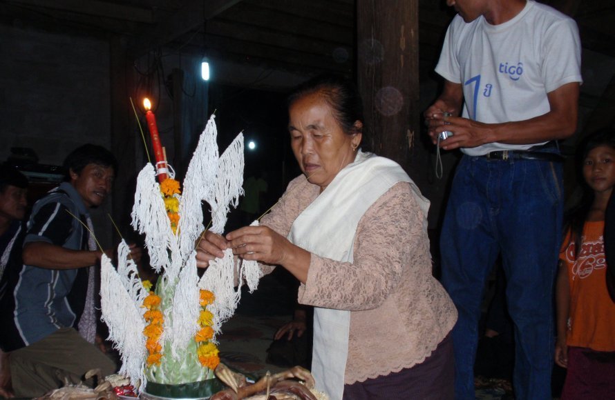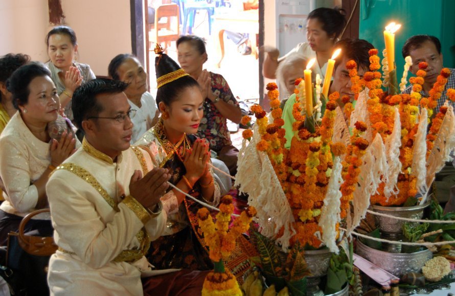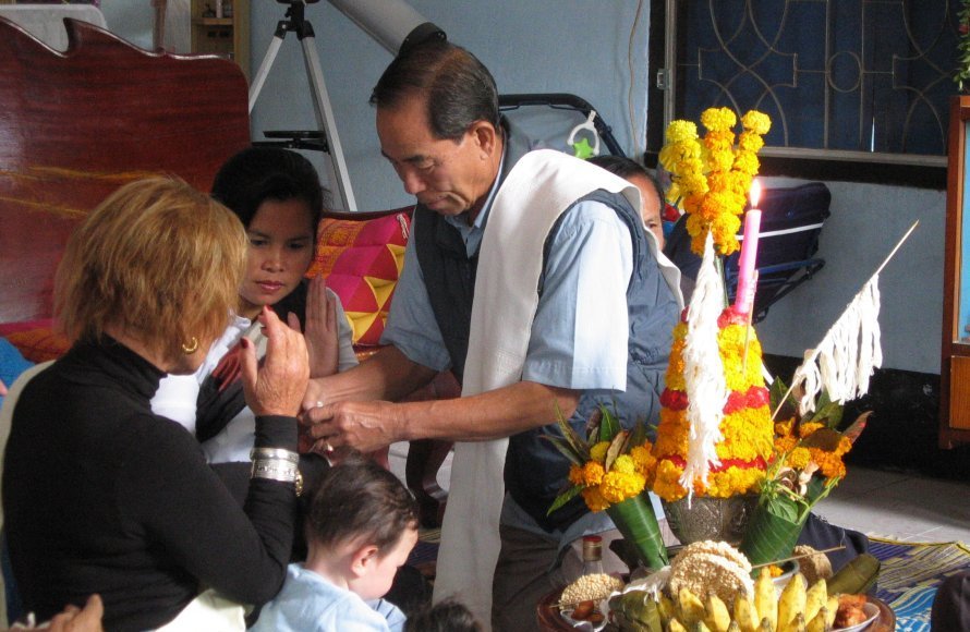 The ceremony begins with the "Mor Phorn" lighting the candles and incense. He then chants the invocation, a melodious Pali or Lao incantation that invites the 32 souls to return to the body of the person being honoured (or to all those present). He asks the spirits, the ancestors, and the guardian deities to bestow their blessings—for good health, for prosperity, for freedom from harm, and for a calm and peaceful mind.